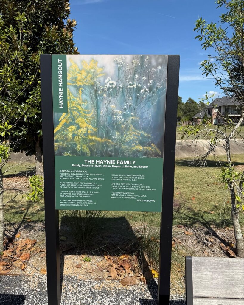 Melissa Bonin shared on Facebook, “So happy to see this in Moncus Park today on my walk. What a lovely job the Haynie Family has done incorporating one of my wildflower paintings and one of my poems into their display along Lake Reaux.”